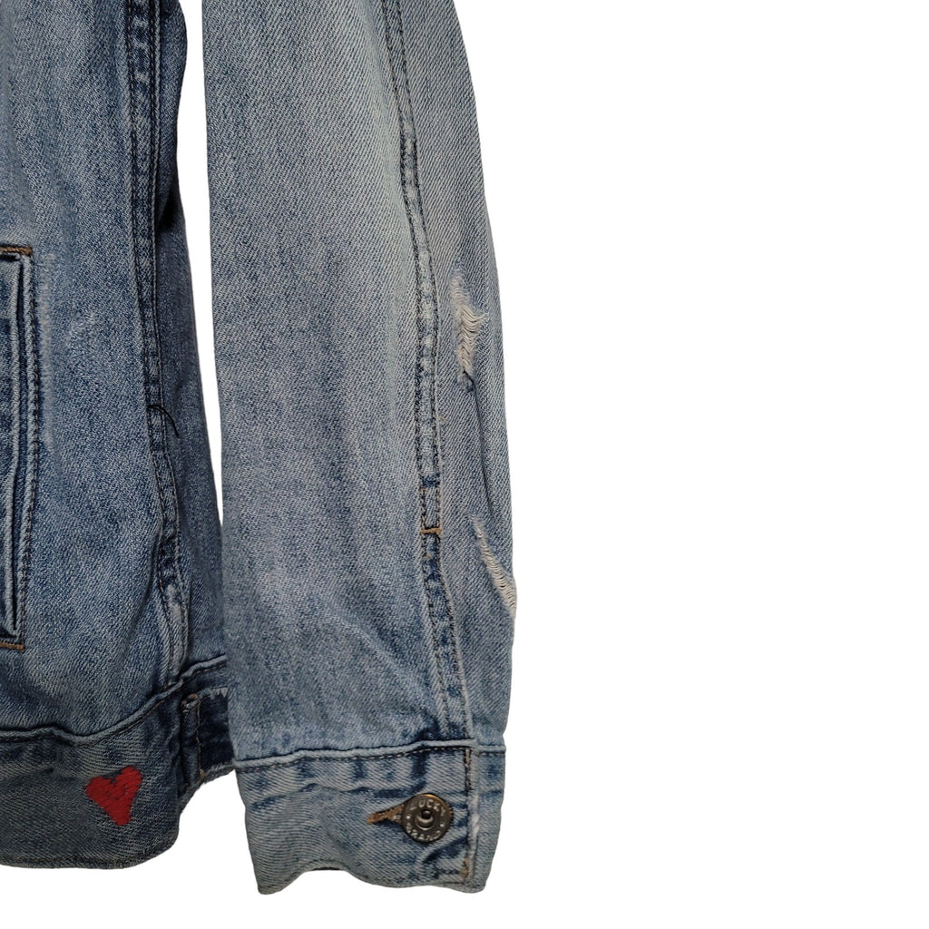 Lucky Brand, The Tomboy Trucker, Distressed Blue Jean Jacket with 4 Pockets, Metal Button Up, Red Heart Bottom Left, Size Small